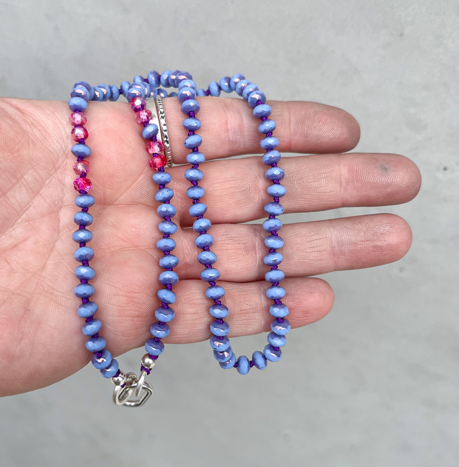 Premium Czech glass faceted fire polished baby rondelle beads in opaque cornflower with metallic purple finish. A few bright pink beads along the length as well, 50cm in length, with a lovely dark purple silk cord knotted between each bead and a small oval sterling silver clasp.