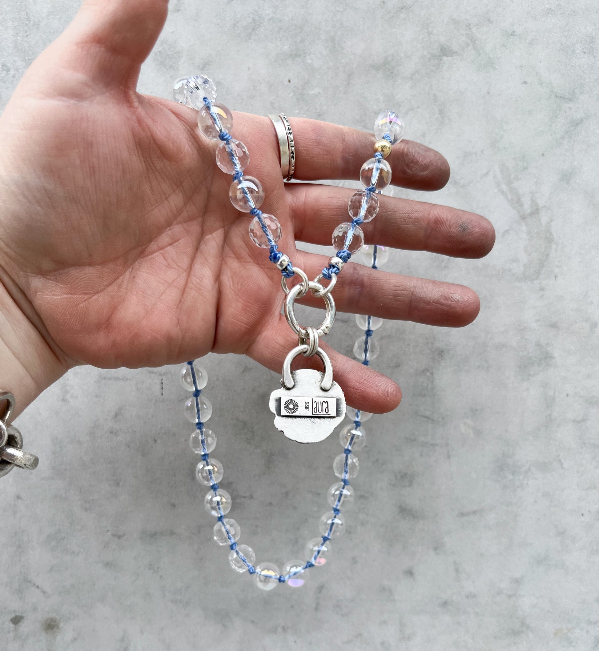 Larimar stone in a bezel setting, sterling silver (925) and fine silver (999).