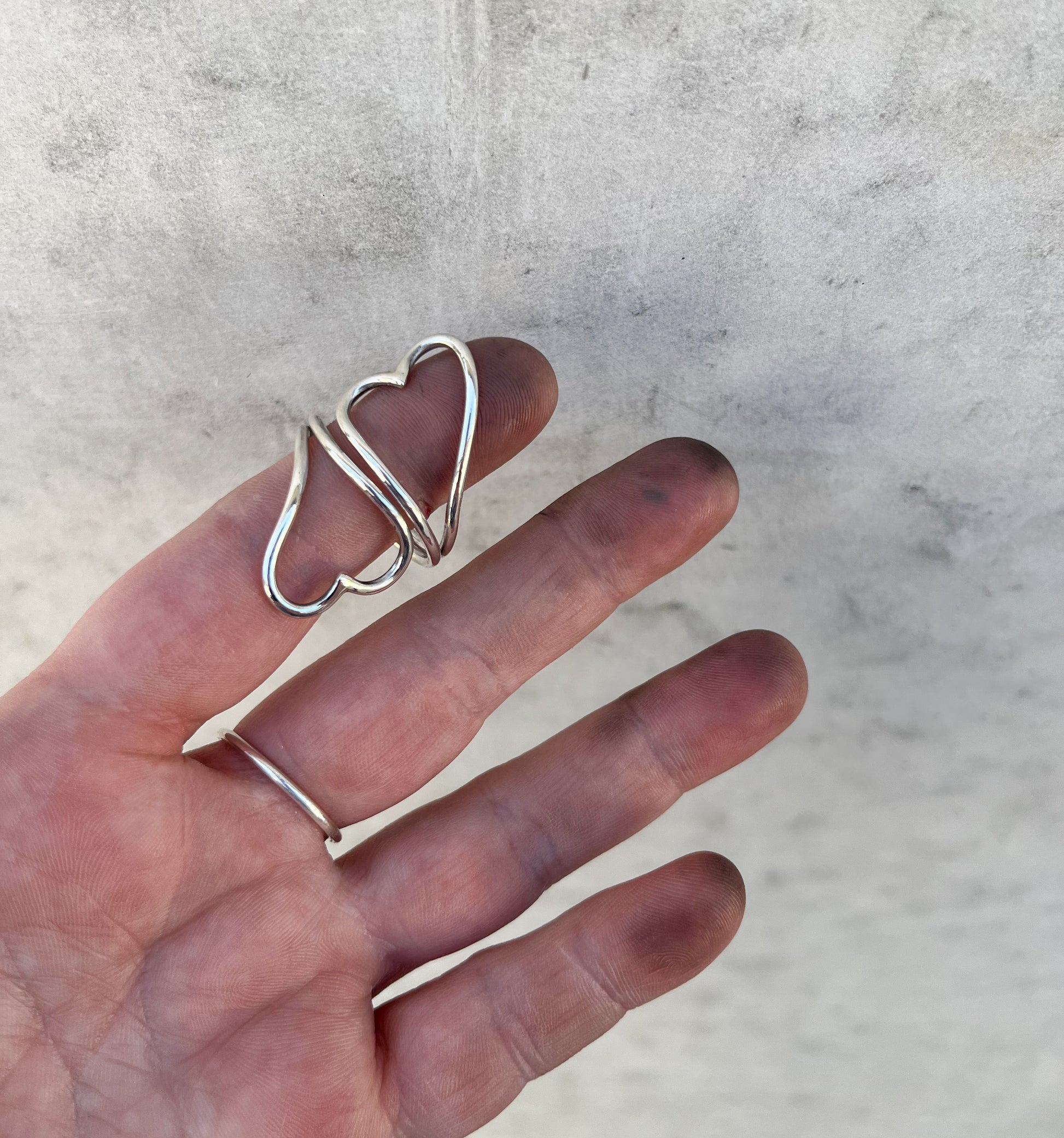 Love heart ring in sterling silver, two hearts that curve around your finger. The ring band comes in smaller for the underneath part of the ring.