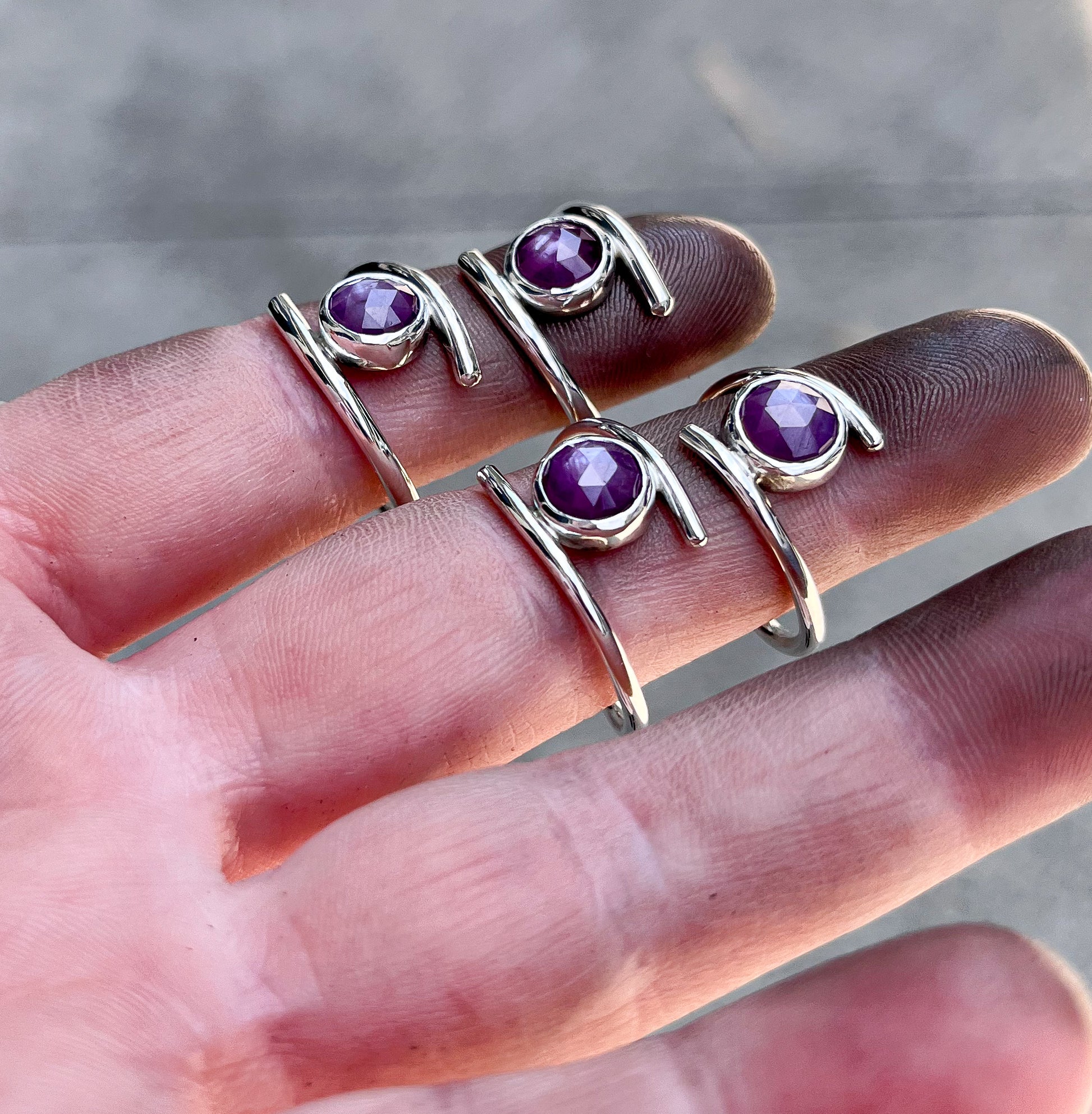 Sterling silver rings with pink star sapphires, 4 rings available. Faceted surface on the sapphires, so the light catches from every angle. Please note that all 4 rings differ slightly as they are handmade. All are just as beautiful though.