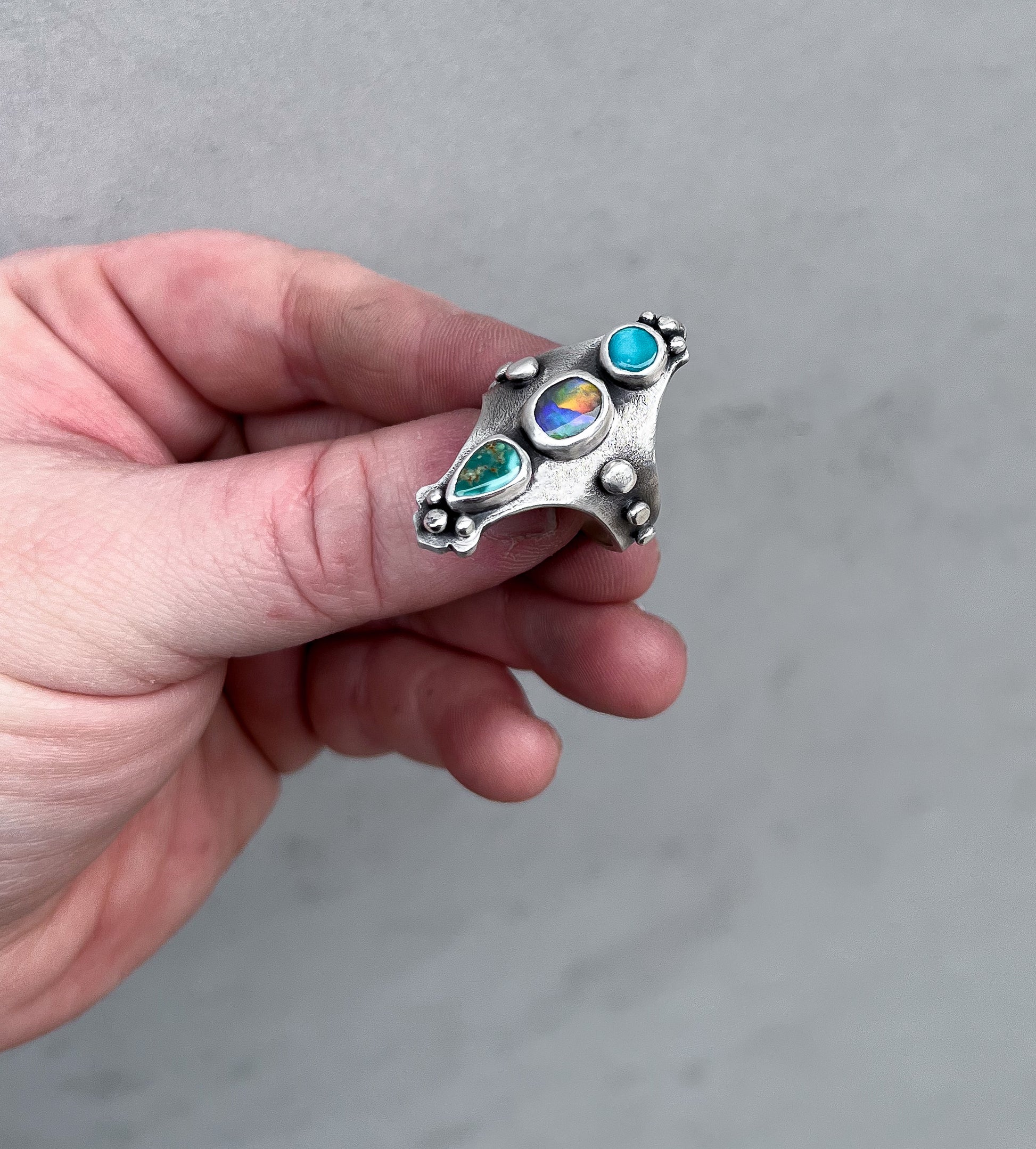 This ring has 3 beautiful stones, it has two pieces of Kingman turquoise and in the middle a black opal from lightning ridge Australia.